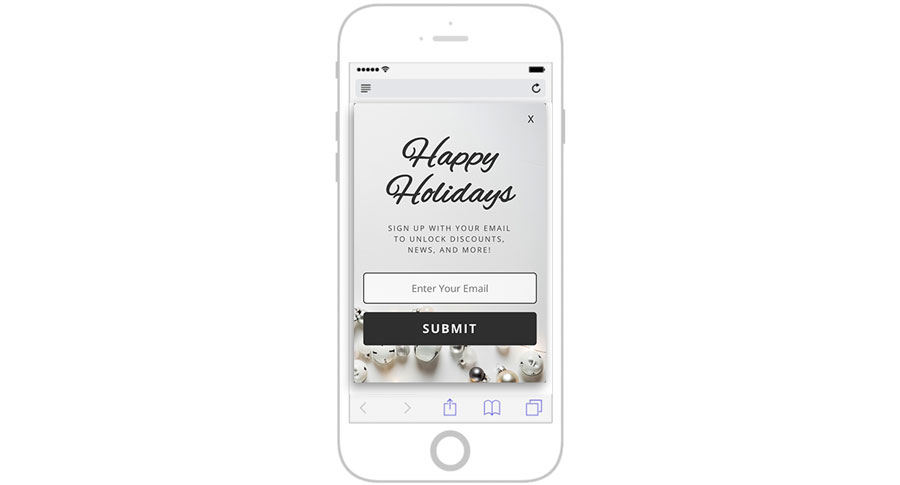 This lead capture pop up will show to visitors on your mobile site after one page load. This is the second of our prebuilt options made to fit within Google's updated best practices for mobile pop ups, which allow for full screen promotions to show if not on the first page load, or if shown by user-generated action (such as a tab click).